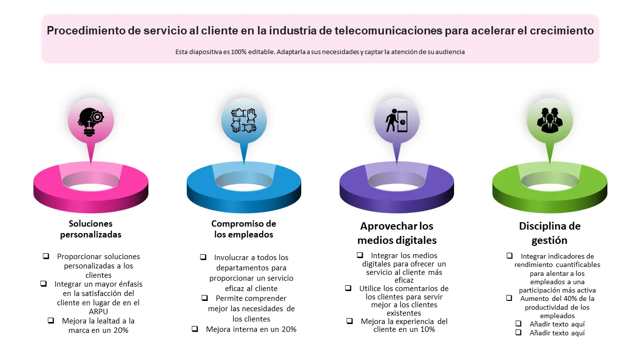 Aumente la satisfacción del cliente de telecomunicaciones y la lealtad a la marca con esta plantilla editable de PowerPoint centrada en los procedimientos de servicio al cliente para acelerar el crecimiento empresarial.