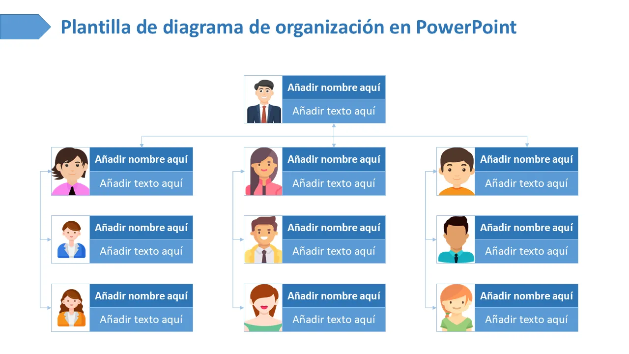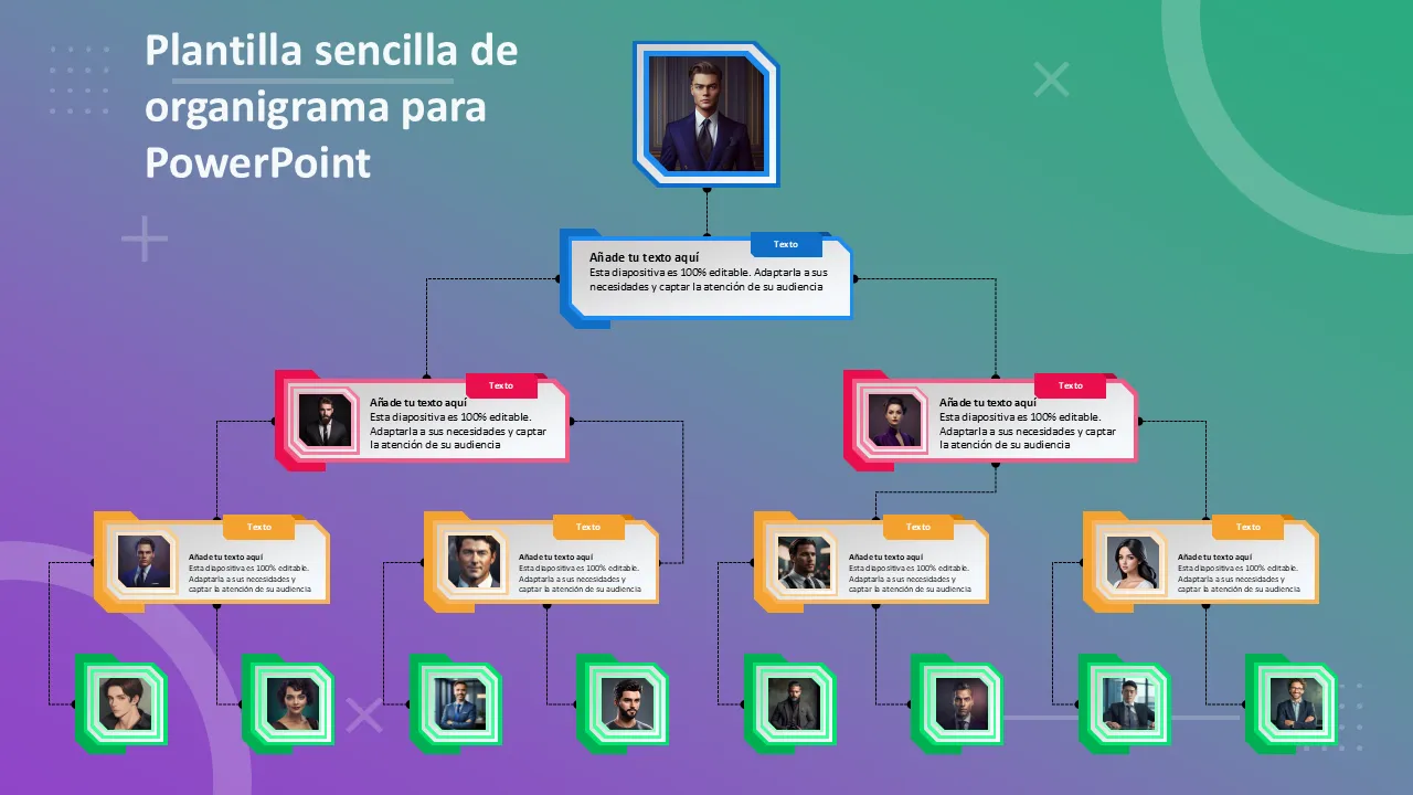 Un organigrama estructurado profesionalmente para el diseño plano de Powerpoint del puesto de empleado para visualizar jerarquías de equipos, estructuras de informes y diseños organizativos. Ideal para presentaciones de recursos humanos, gestión e incorporación.