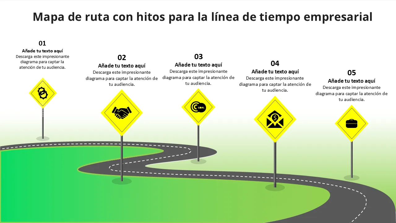 Hoja de ruta con hitos para la línea de tiempo empresarial Diseño plano de PowerPoint Plantilla de PowerPoint para presentaciones profesionales