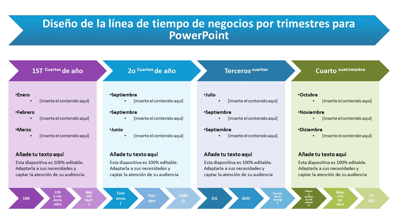 Diseño de línea de tiempo empresarial por trimestres para PowerPoint
