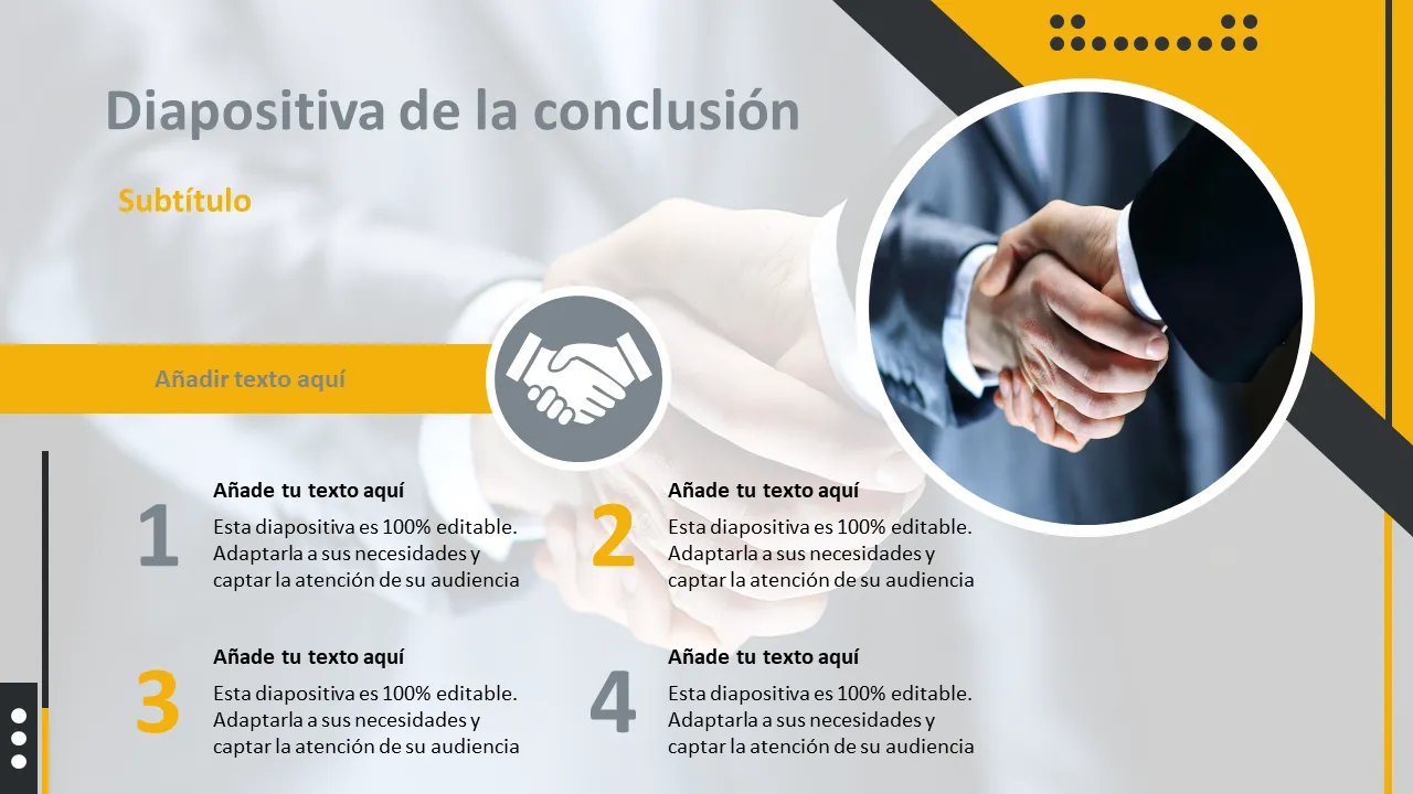 Una plantilla de diapositiva de conclusión limpia y profesional diseñada para presentaciones comerciales. Perfecto para resumir puntos clave, impulsar la acción y dejar una impresión duradera. Descargar ahora.