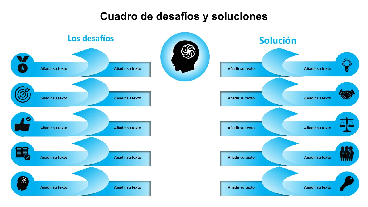 Una plantilla de PowerPoint limpia y profesional diseñada para presentar visualmente los desafíos empresariales y sus correspondientes soluciones. Ideal para planificación estratégica, revisiones ejecutivas y presentaciones de consultoría.