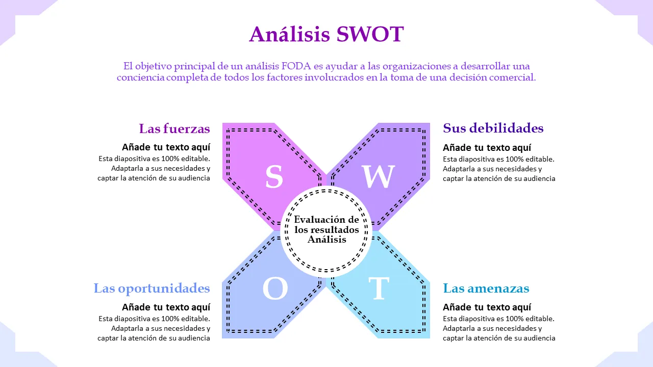 - Diseño de matriz FODA prediseñado con secciones codificadas por colores para una fácil diferenciación visual