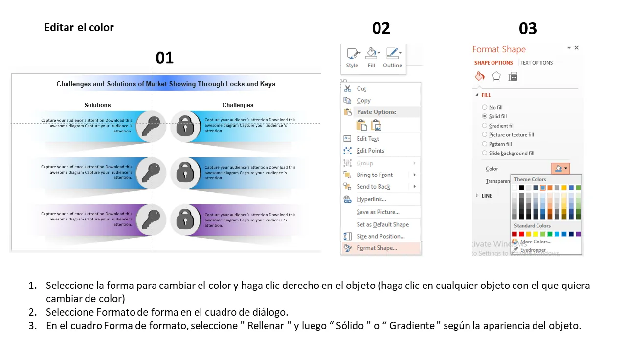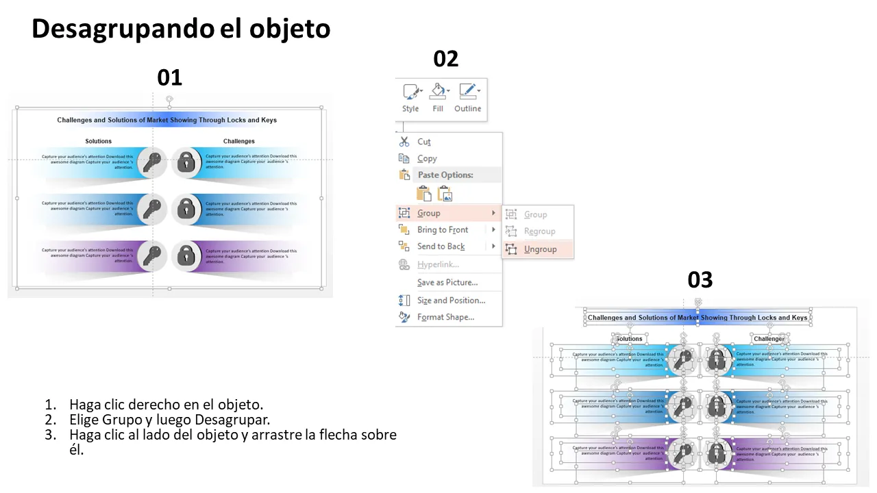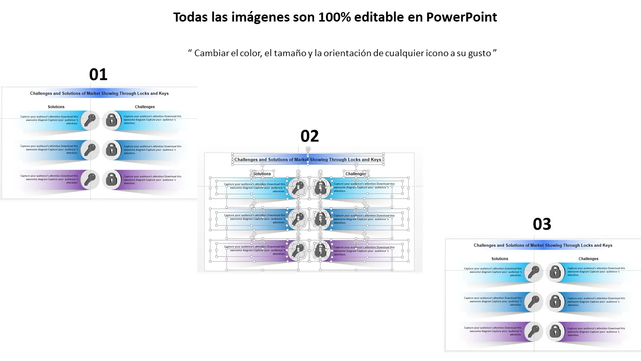 - Diseños de diapositivas personalizables para presentar desafíos y soluciones específicas