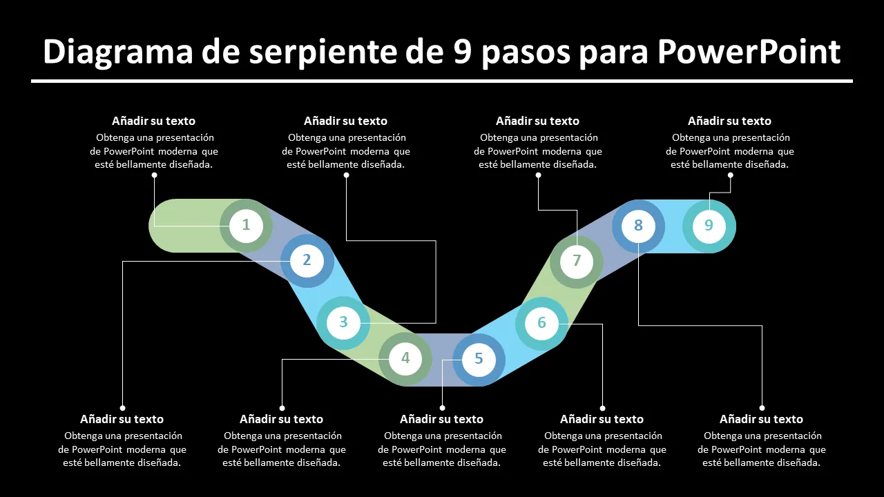 Explicación de la plantilla de PowerPoint con diagrama de serpiente colorido de 9 pasos