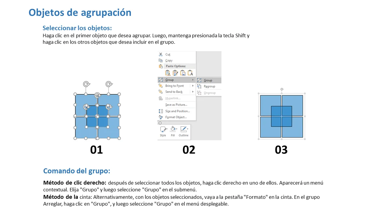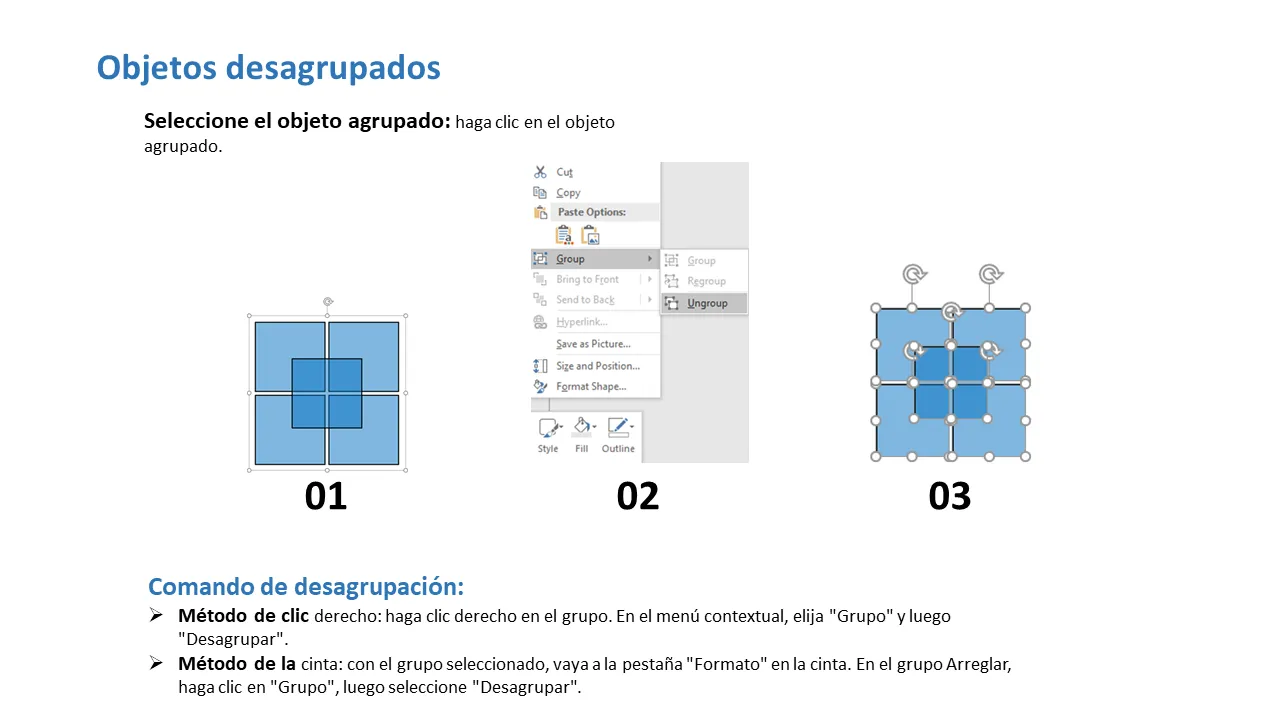 - Incluye instrucciones de agrupación y desagrupación para manipulación avanzada de diapositivas