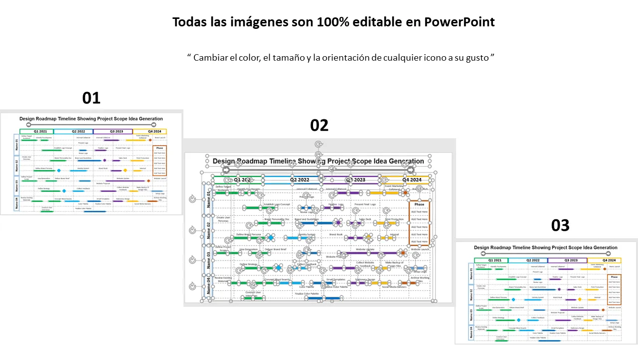 Características de Diseño de la hoja de ruta, cronograma que muestra el alcance del proyecto, generación de ideas