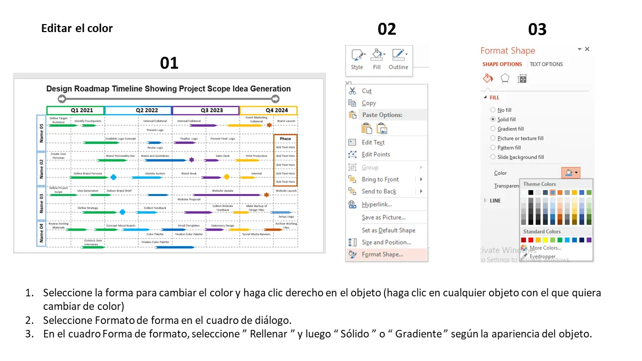- Diseño de línea de tiempo prediseñadas con fases ampliables para la generación de ideas y la definición del alcance