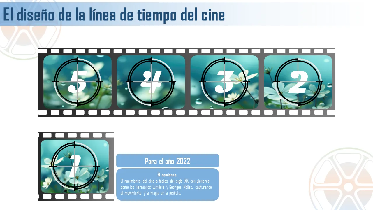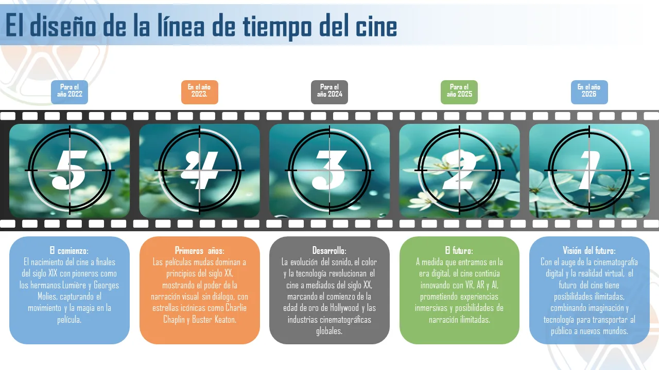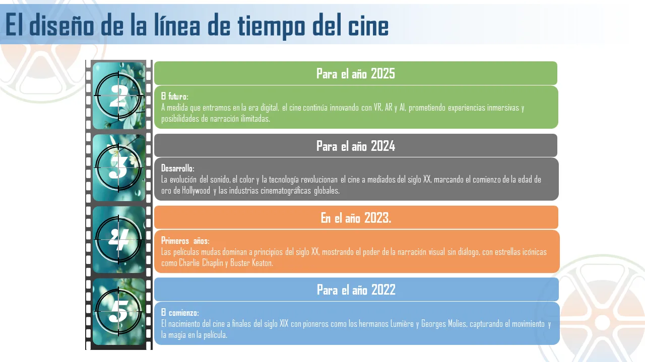 Esta plantilla de PowerPoint visualmente atractiva está diseñada para mostrar la evolución del cine a través de líneas de tiempo estructuradas e hitos cinematográficos. Destaca movimientos clave, directores influyentes y películas históricas que dieron forma a la industria. Ideal para presentaciones educativas, profesionales o creativas, esta plantilla da vida a la historia del cine con un diseño limpio y un flujo visual dinámico.