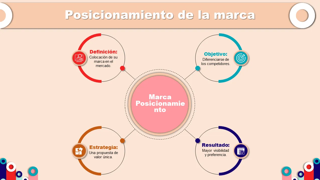 - Diapositivas prediseñadas para posicionamiento de marca, personalidad y mensajes visuales con diseño consistente