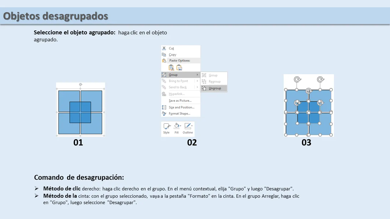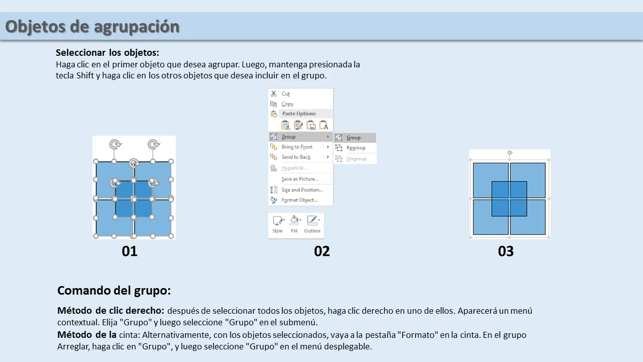 - Incluye guías instructivas para agrupar y organizar elementos de manera eficiente
