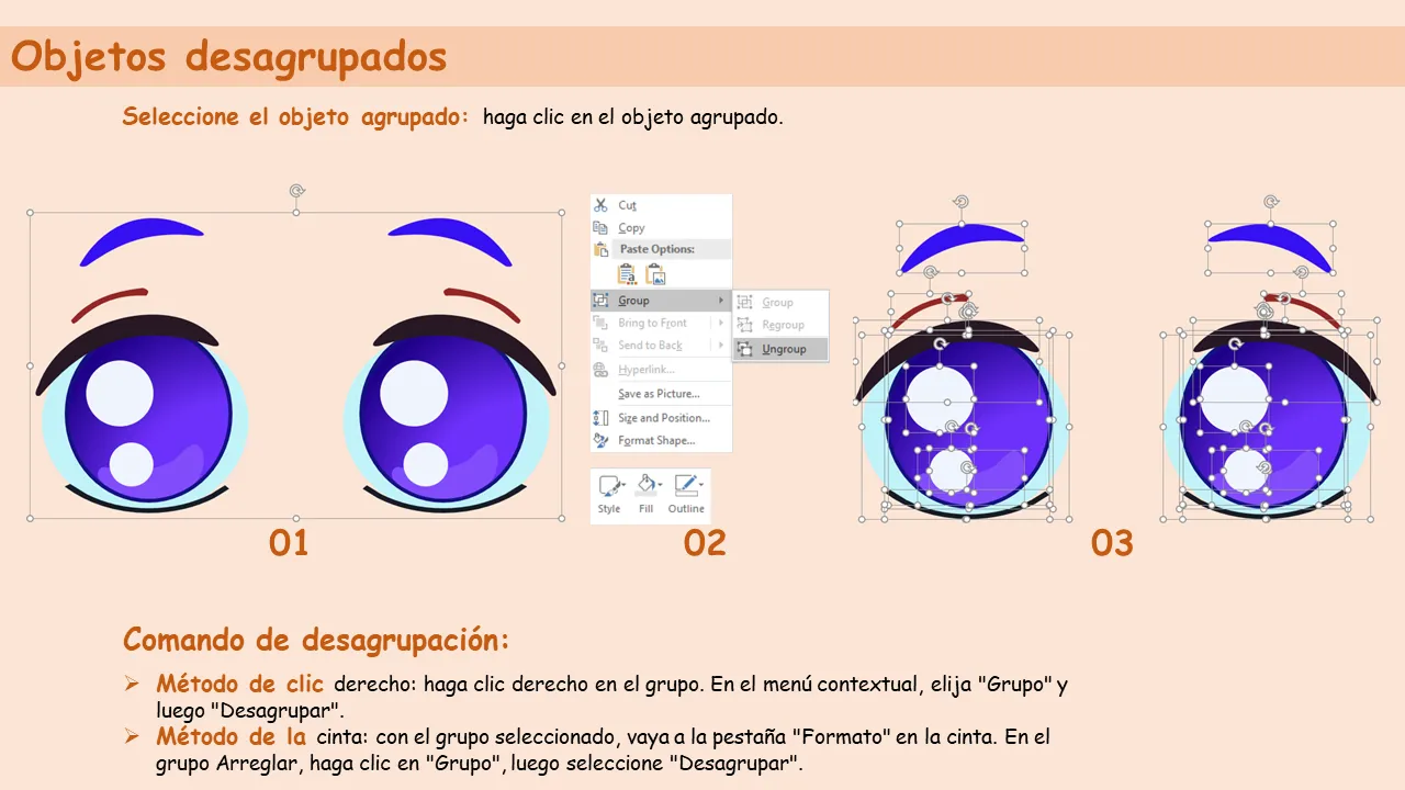 - Incluye instrucciones para agrupar y desagrupar elementos para edición avanzada