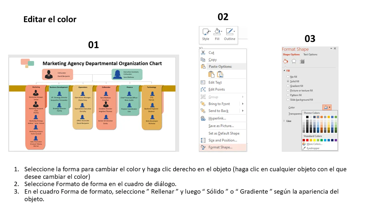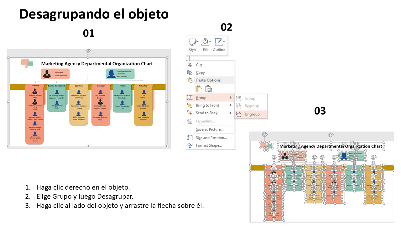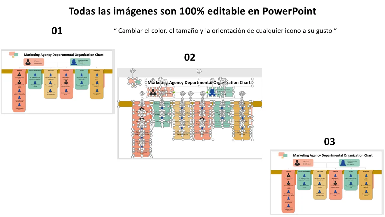 Características de Plantilla de PowerPoint para organigrama departamental de agencia de marketing para presentaciones profesionales