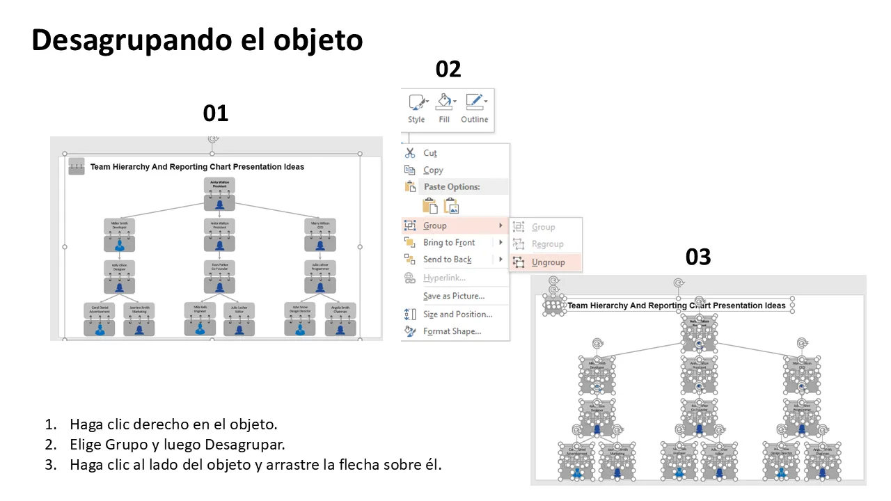 Explicación de ideas para presentaciones de gráficos de informes y jerarquía de equipos