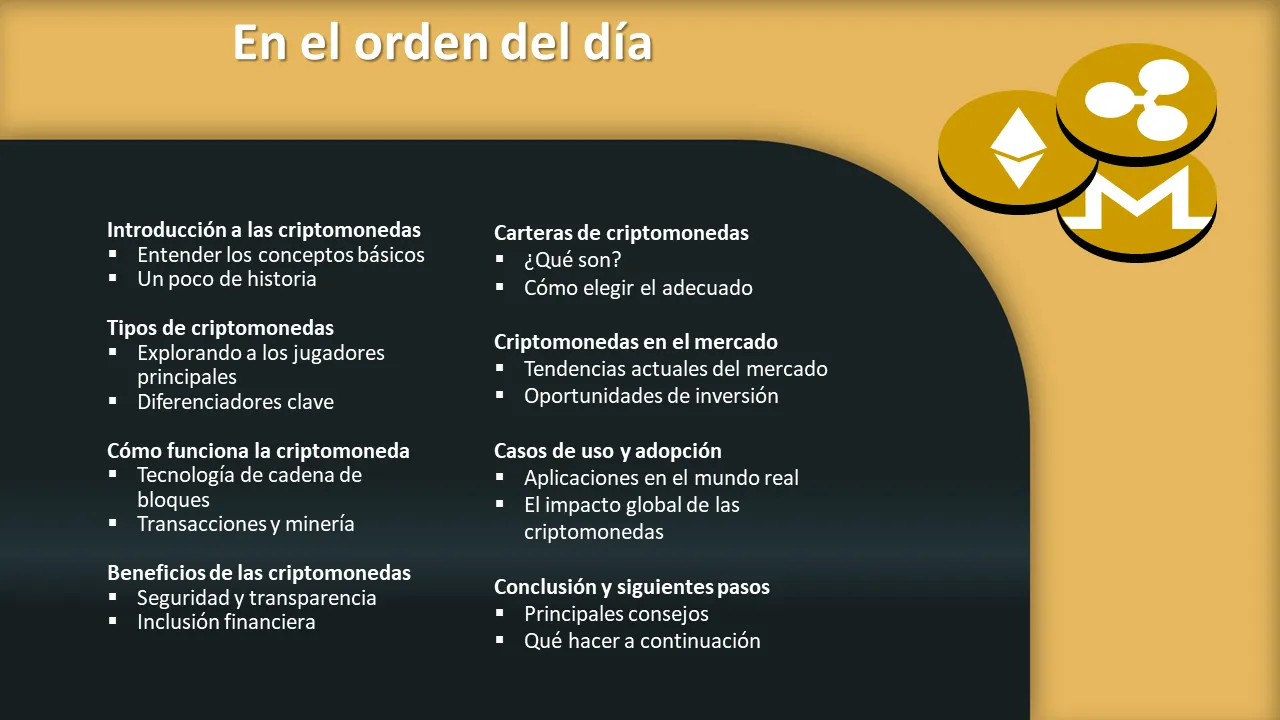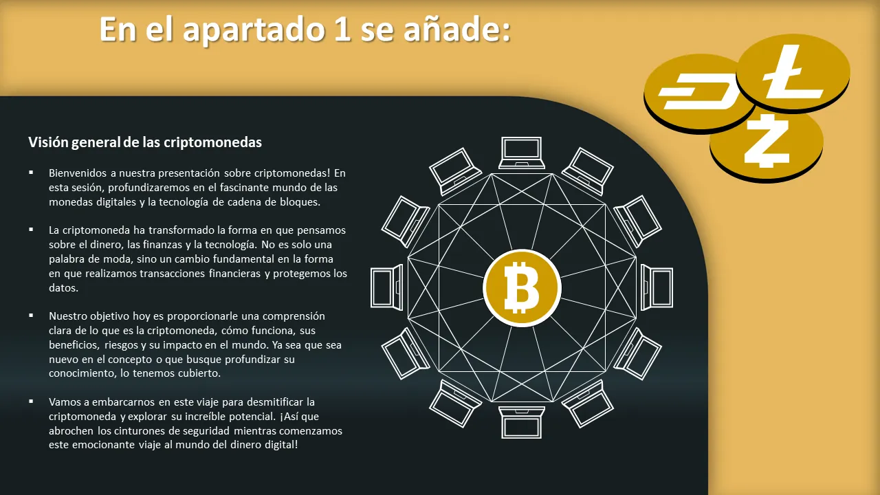 - Diapositivas prediseñadas que cubren una descripción general, beneficios, riesgos y tendencias futuras de las criptomonedas