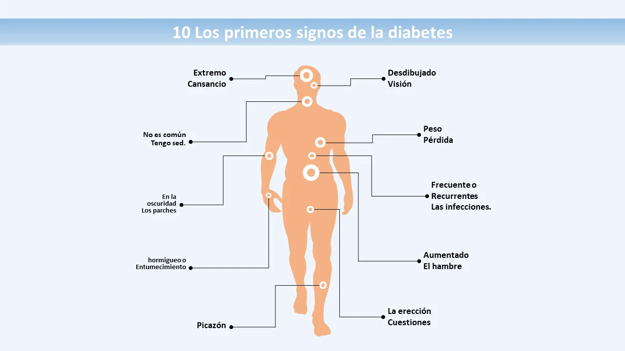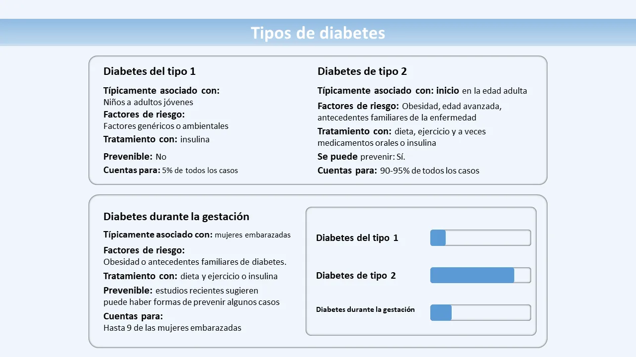 - Diapositivas visualmente estructuradas que cubren los síntomas, las causas y la prevención de la diabetes