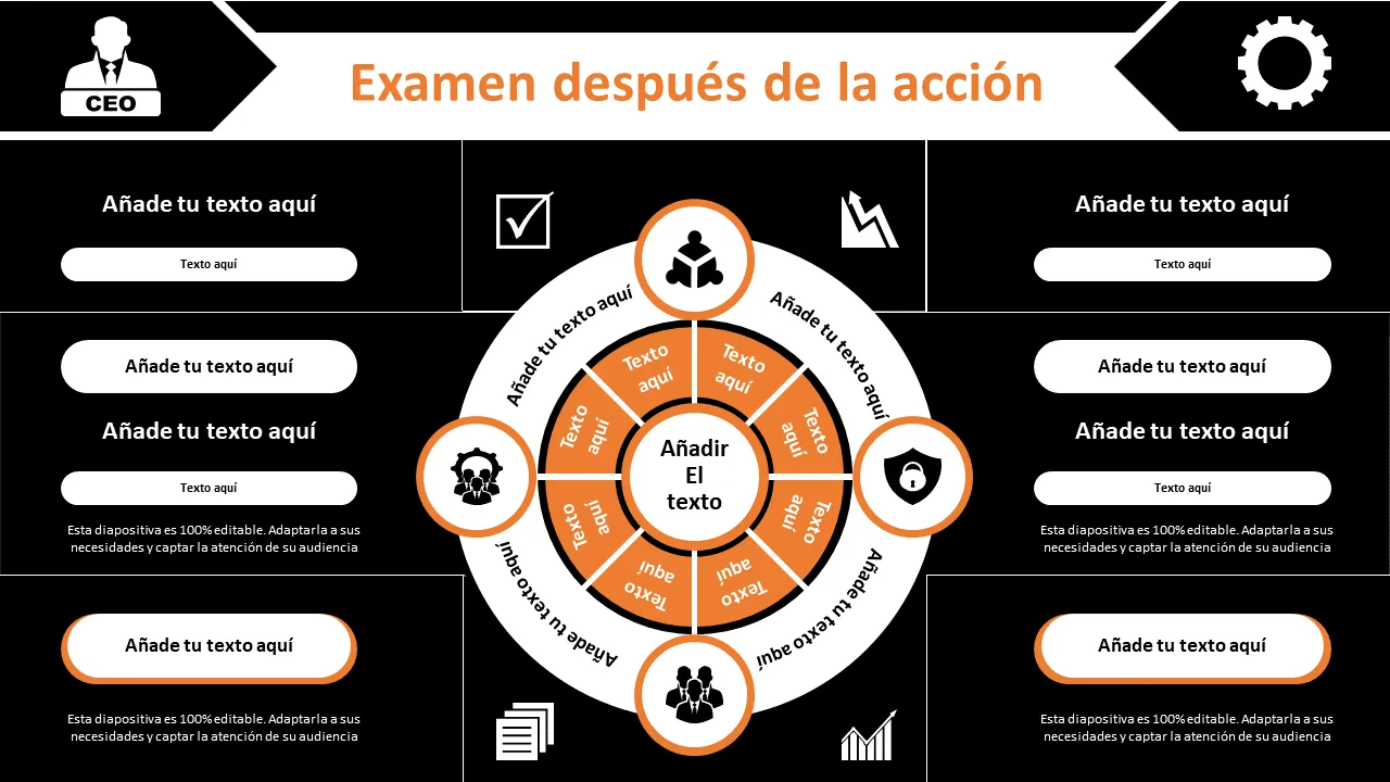 Esta plantilla de PowerPoint de revisión posterior a la acción está diseñada para ayudar a los equipos y ejecutivos a evaluar sistemáticamente iniciativas pasadas, capturar ideas clave y traducir lecciones en mejoras procesables. Creado para la estrategia empresarial y la revisión operativa, respalda la reflexión estructurada y la toma de decisiones en todos los departamentos y niveles de liderazgo. La plantilla promueve la mejora continua al alinear los comentarios con los objetivos estratégicos y las métricas de desempeño.