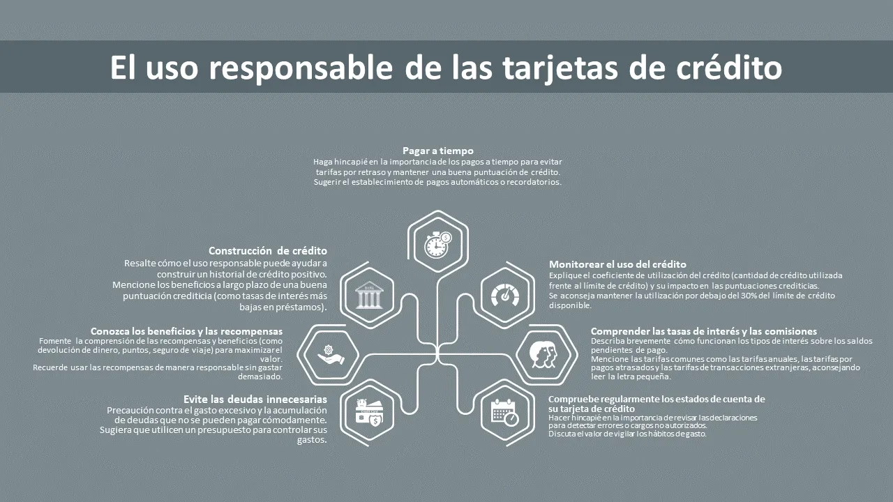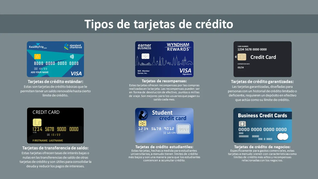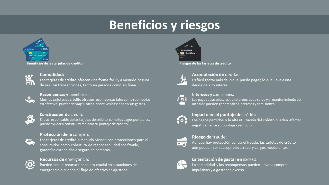 - Jerarquía visual clara para explicar los tipos de tarjetas de crédito y sus beneficios