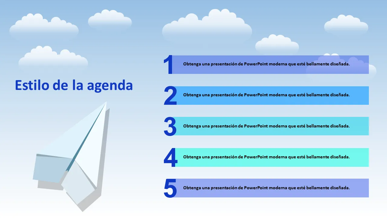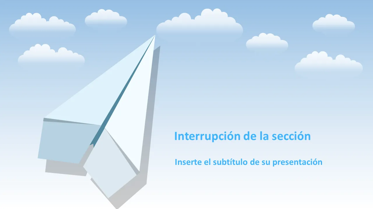 Esta plantilla de PowerPoint visualmente atractiva presenta un motivo moderno de avión de papel azul que simboliza la innovación, el movimiento y la estrategia con visión de futuro. Diseñado para profesionales de negocios, combina una estética elegante con diseños intuitivos para mejorar la entrega de mensajes. La plantilla es ideal para presentaciones que requieren una apariencia fresca y dinámica manteniendo al mismo tiempo el profesionalismo corporativo. Su estructura limpia admite contenido complejo sin abrumar al espectador.