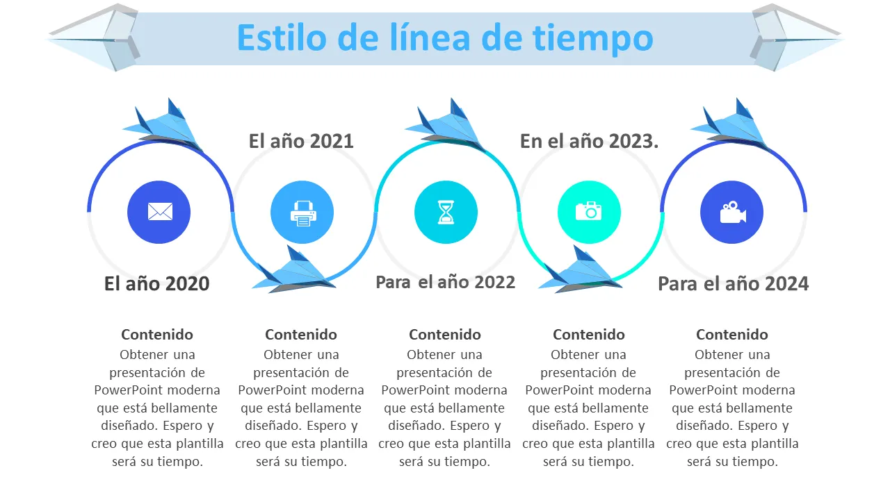 Explicación de la plantilla de PowerPoint con diseño de avión de papel azul