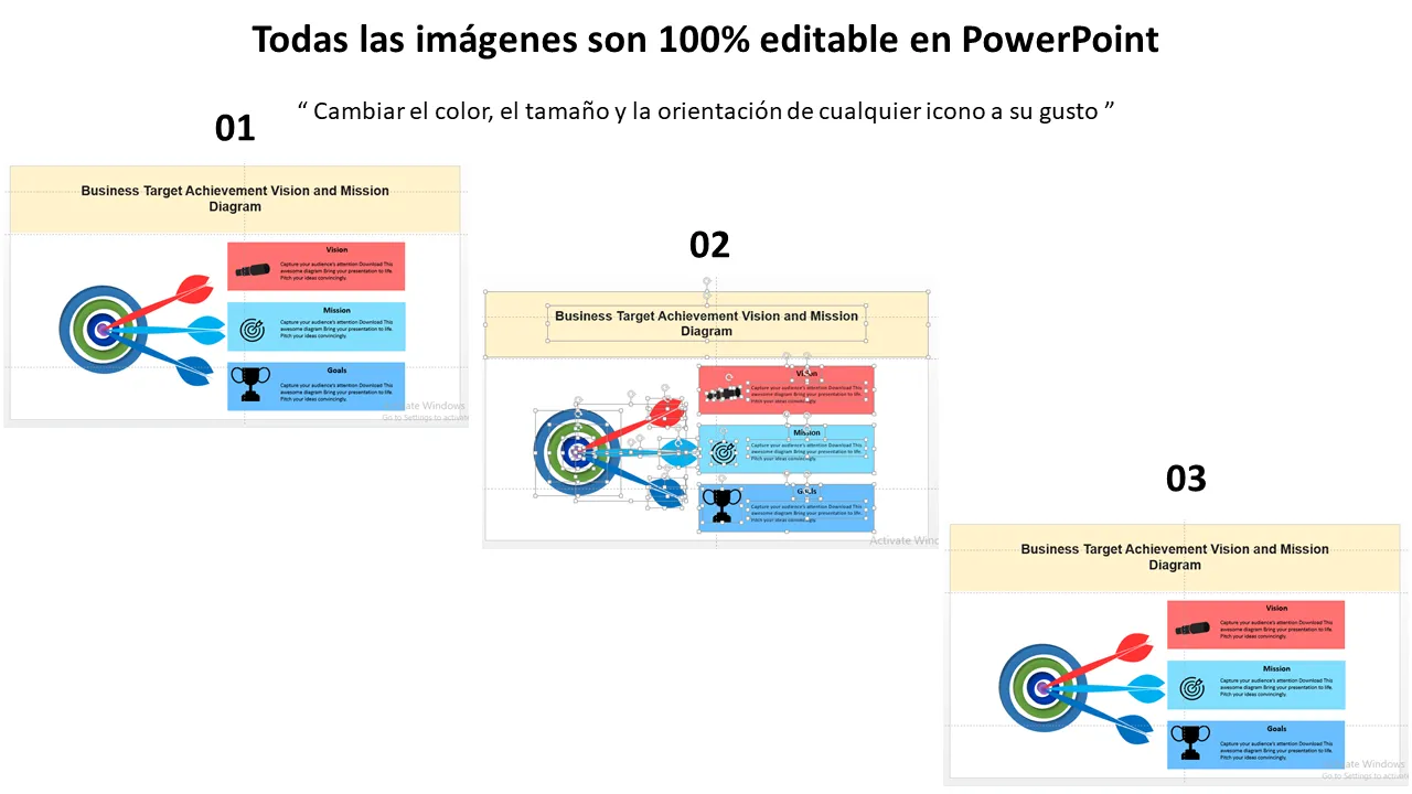 Características de Plantillas de PowerPoint de diagrama de misión y visión de logro de objetivos comerciales