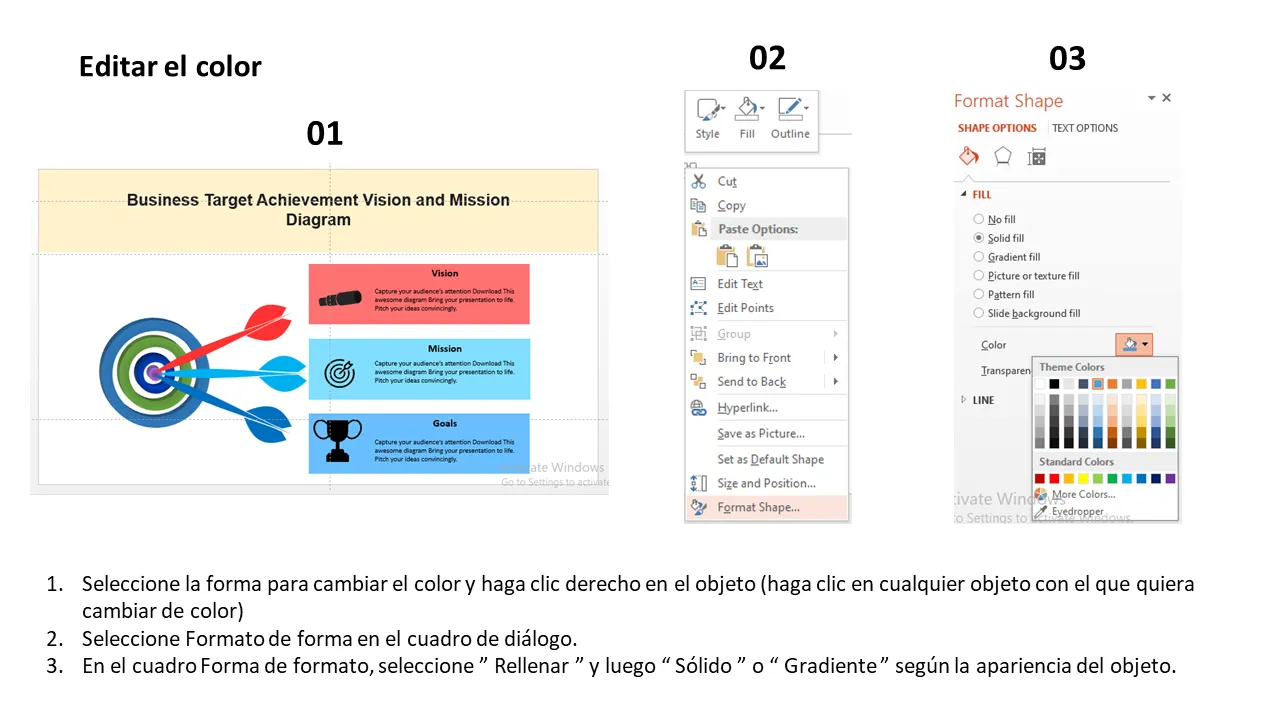 - Diseño de diagrama personalizable con cuadros de texto editables para declaraciones de visión y misión