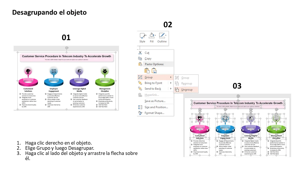 Esta plantilla profesional de PowerPoint está diseñada para ayudar a las empresas de telecomunicaciones a delinear y presentar un procedimiento claro de servicio al cliente que impulse el crecimiento a través de una mayor satisfacción y eficiencia operativa. Enfatiza las estrategias centradas en el cliente sobre las métricas tradicionales como ARPU, lo que lo hace ideal para equipos de liderazgo que buscan realinear prioridades. La plantilla es totalmente personalizable y visualmente atractiva, lo que ayuda a los presentadores a comunicar mejoras en los procesos e iniciativas de participación de los empleados de manera efectiva.