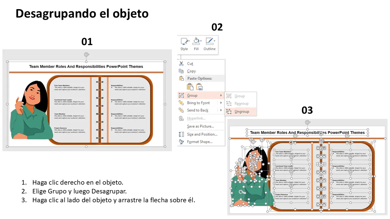 Explicación de los temas de PowerPoint sobre las funciones y responsabilidades de los miembros del equipo