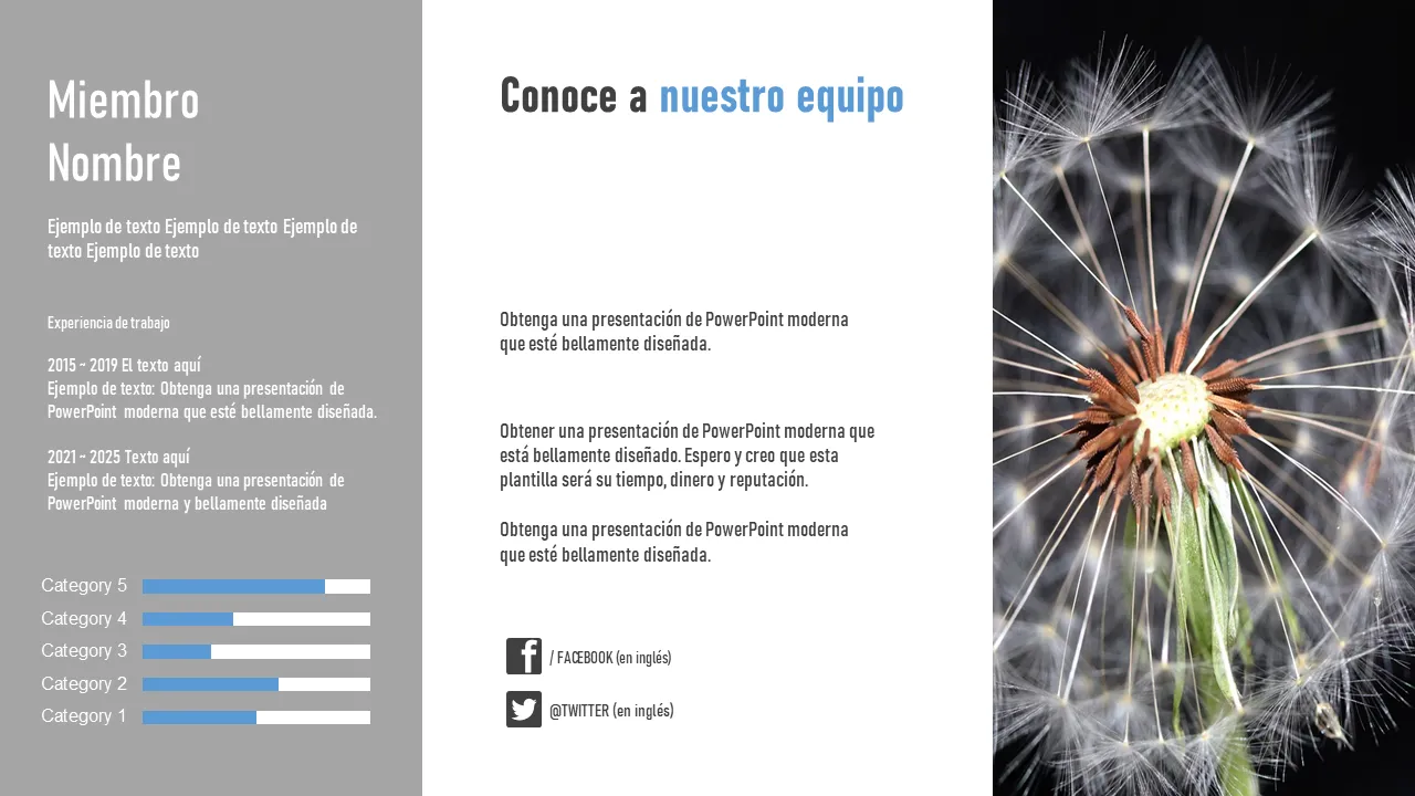 Esta elegante plantilla de PowerPoint utiliza la metáfora de las semillas de diente de león que soplan con el viento para simbolizar el crecimiento, la dispersión y la expansión estratégica. Ideal para presentaciones de estrategias comerciales, representa visualmente cómo las ideas, los mercados y las oportunidades se distribuyen orgánicamente entre regiones o bases de clientes. El diseño combina una estética moderna con imágenes naturales para crear presentaciones memorables y atractivas que resuenan en el público.
