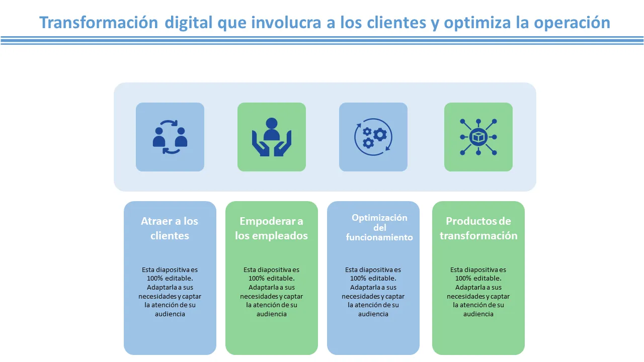 - Diapositivas preformateadas para los pilares de la estrategia digital: adopción de tecnología, cambio organizacional y análisis